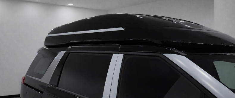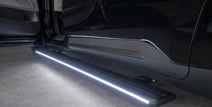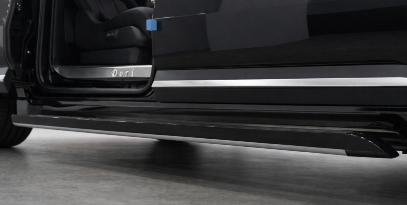 Stylish side steps enhance boarding convenience while seamlessly blending with the limousine’s luxurious aesthetics, adding a sleek and functional design element.