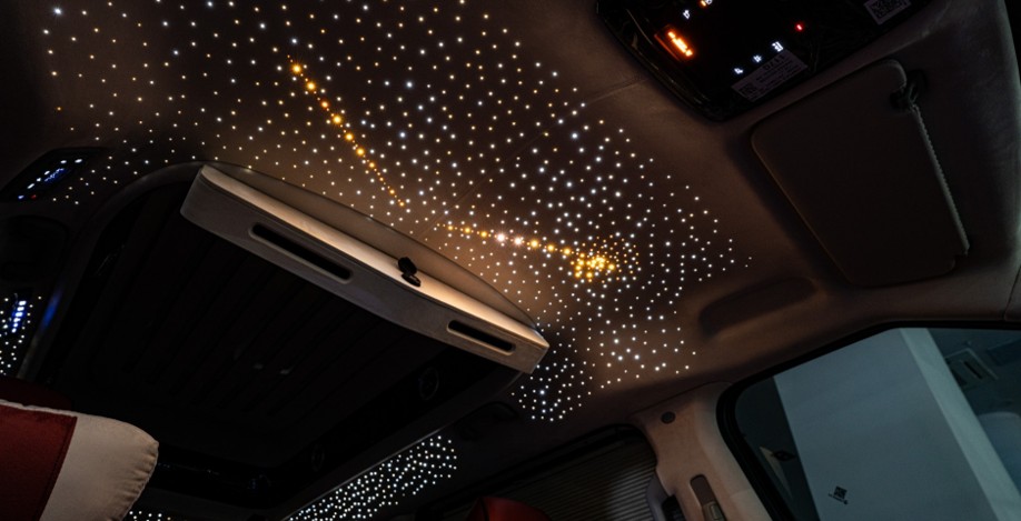 Hundreds of starlike lights embedded in the ceiling create a soft, ambient glow—evoking the feeling of sitting beneath a night sky in a private, luxurious atmosphere.